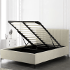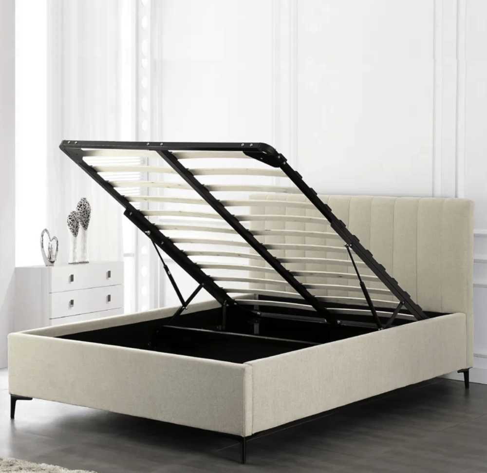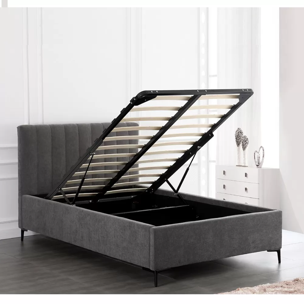 - מיטה זוגית מרופדת בעיצוב מודרנירגלי ברזל גבוהות, ארגז מצעים מובנה, מרווח, מתרומם מחזית המיטה, עם מנגנוני בוכנות להרמה קלה
