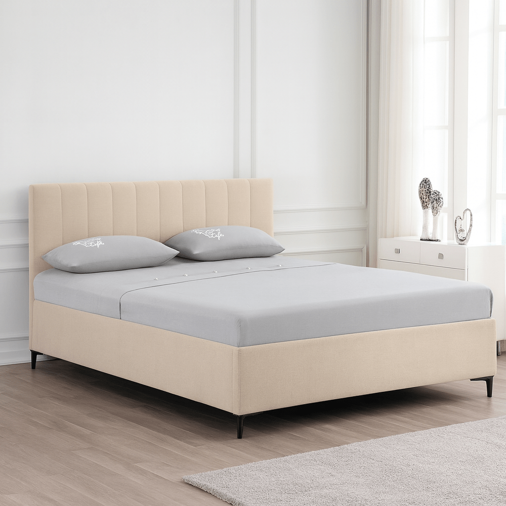 - מיטה זוגית מרופדת בעיצוב מודרנירגלי ברזל גבוהות, ארגז מצעים מובנה, מרווח, מתרומם מחזית המיטה, עם מנגנוני בוכנות להרמה קלה
