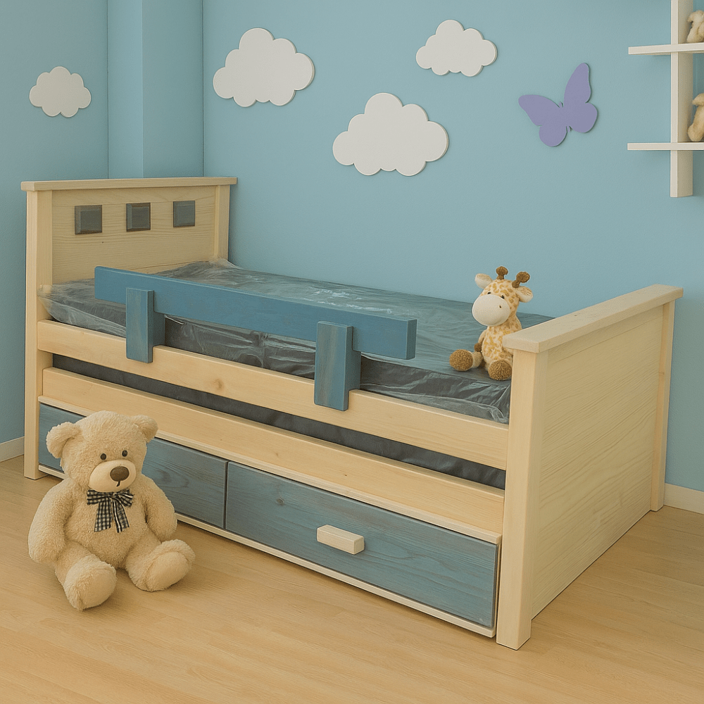 מיטת ילדים מעץ מלא מידה 80/190 עם מגן טף, מיטה נוספת עם מגירות ושני מזרנים אורטופדים.