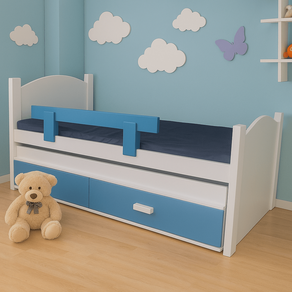 מיטת ילדים מעץ מלא עם מגן טף 80/190 מיטה נוספת עם מגירות ושני מזרנים אורטופדים.